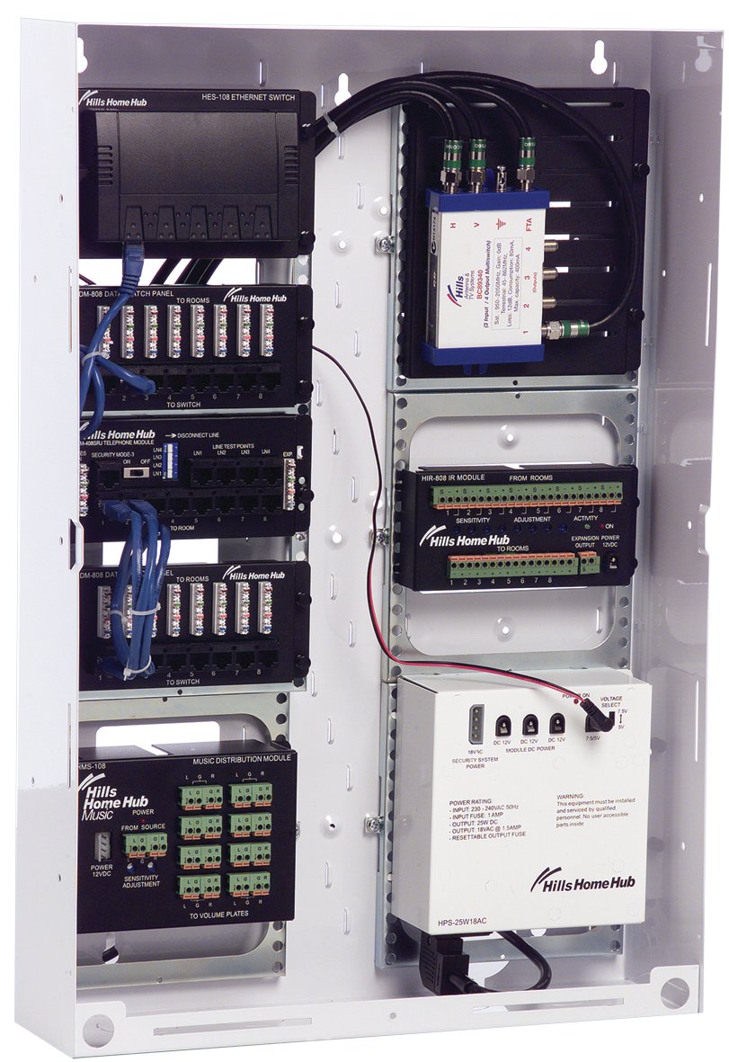 HOME HUBS / STRUCTURED CABLING The Hills Home Hub delivers and distributes data, phone, video, audio and TV signals using the latest in data and TV cables from a centrally located enclosure to specially configured wall outlets in any room of your choice. Structured cabling using the Hills Home Hub is preferably planned at the same time as your electrical wiring. The central enclosure is home to the devices that enable the delivery and distribution of these signals. It also houses the security system central controller.  |